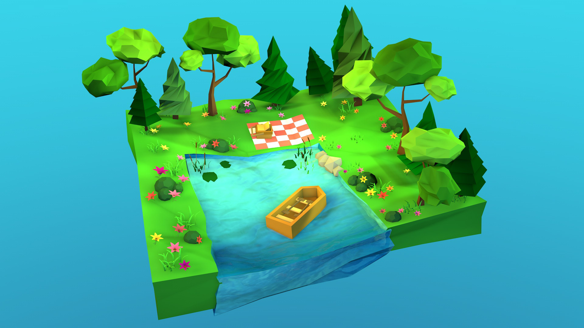 This island was inspired by a nice spring day; one where you could go out and enjoy the sunshine. When I was trying to come up with what would be in this scene, I knew I wanted flowers. They are the pinnacle of how we see spring, the season of regrowth and bloom. I thought a nice touch would be the picnic area by the pond, as a way to connect and admire nature while enjoying friends' company. My favourite part of creating these 3D objects was definitely the different trees. I got to make them vary in size, shape, and colour. I was able to go a lot deeper with the tools in Cinema 4D, further widening my knowledge of this application and its abilities.